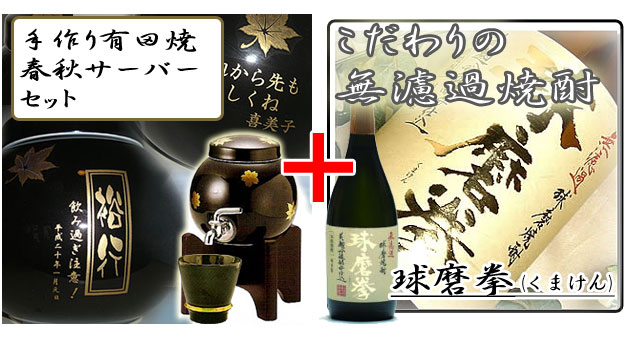 キレイなプリント方式での名入れなので、仕上がり大満足☆当店人気の有田焼 春秋焼酎サーバーに当店一番人気の焼酎グラスと本格米焼酎がついてなんとこのお値段! |
