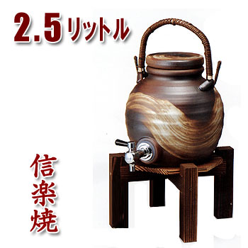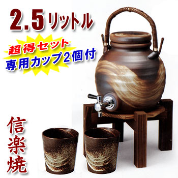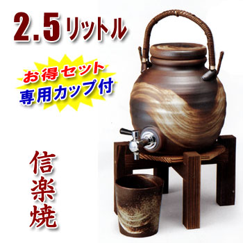 信楽焼 焼酎サーバー 鉄赤刷毛目2.5L お得セット(焼酎カップ・焼杉木台付)