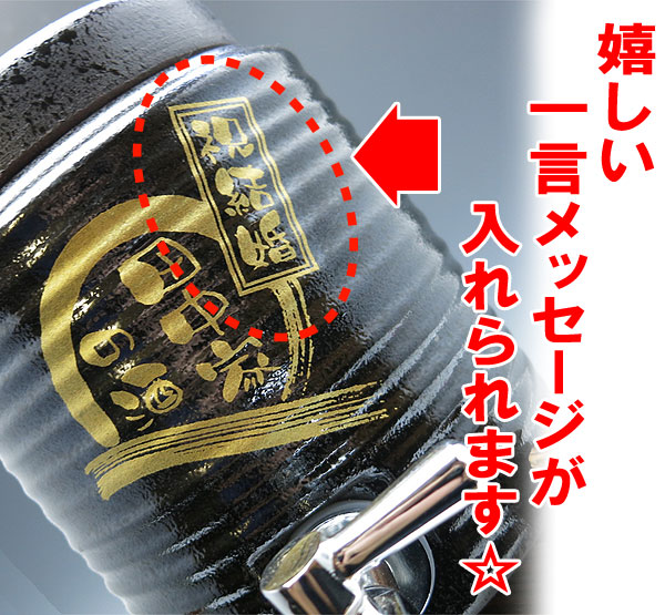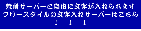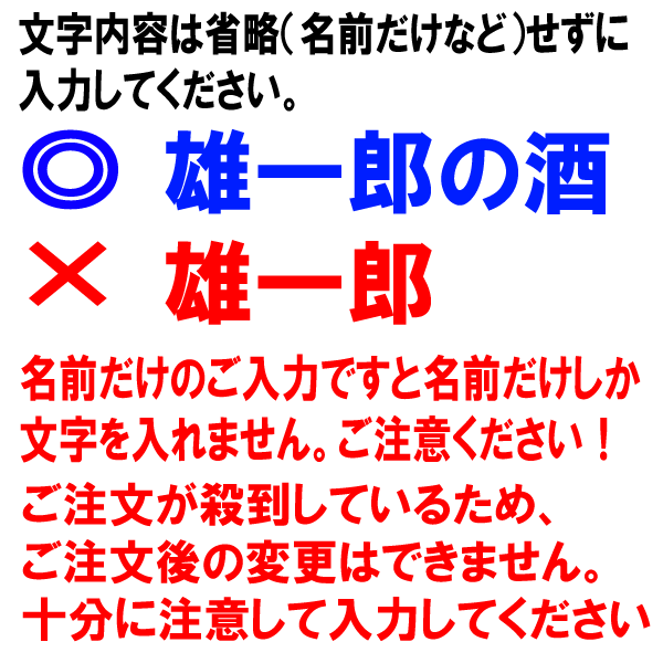 【例2(焼酎サーバーとカップに文字を入れる場合)】 サーバー 正面 パターンB バジョカ体 ●一言メッセージ 祝古希 ※一言メッセージ(3文字まで)の記入が無い場合はメッセージは入りません。 ●佑介の酒 ※サーバーへの文字入れは5文字までです! カップ 1個目:佑介 2個目:早苗 ※カップへの文字入れは1個735円(税込み)必要になります。