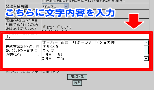 注文画面の一番下の連絡事項記入欄に例のように文字内容を入力してください。